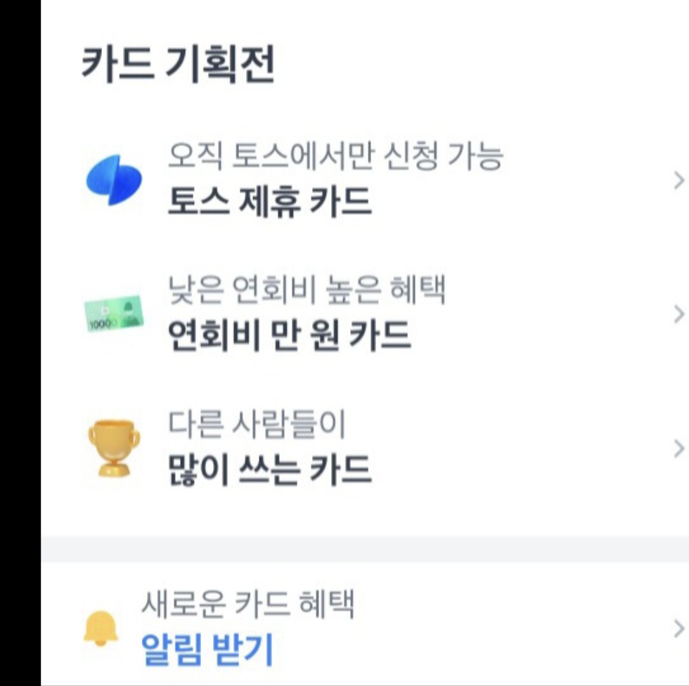 심지어 카드 기획전이나, 새로운 카드 혜택 알림받기 기능까지 넣어두어서 토스앱과 사용자를 연결할 수 있는 미끼들을 많이 던져두었습니다..