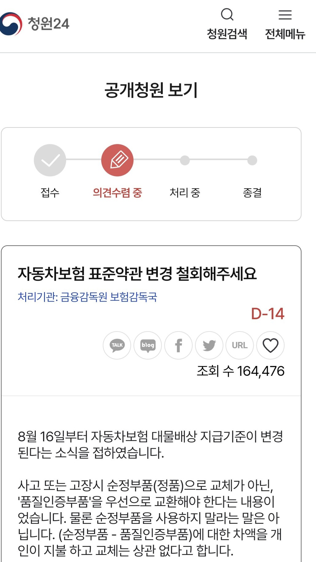 “보험 가입 시 정품과 대체 부품 중 고를 수 있게 해달라”고요.